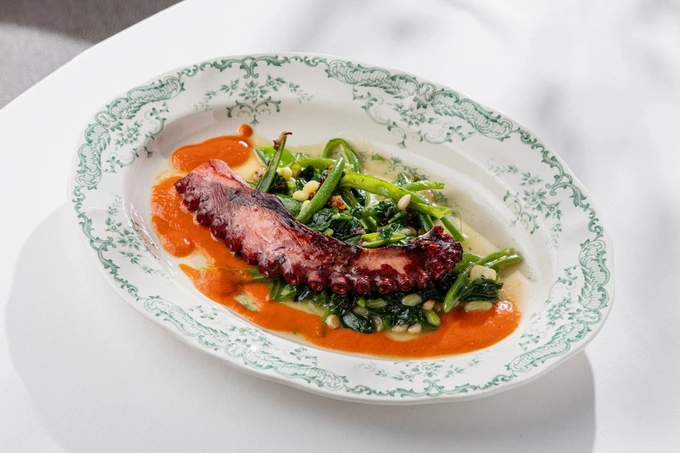 Печеный осьминог с фасолью и томатным соусом — 3 200 рублей
