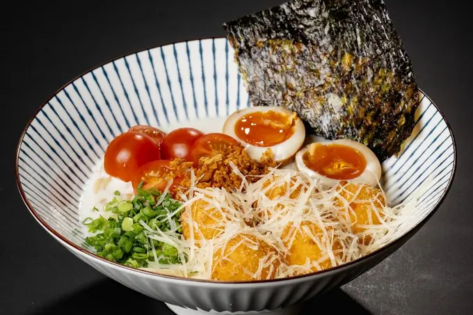 Сливочный рамен с креветками темпура в миндале — 1 180 рублей