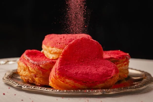 14 февраля одно из самых популярных блюд из меню, сладкий пончик в ресторане при Андреевском дворе будут готовить — вы угадали — в форме сердца! Внутри хрустящего слоеного теста найдете ванильный заварной крем и малиновое пюре, блюдо увенчано сублимированной малиновой крошкой. Стоимость десерта — 550 рублей.