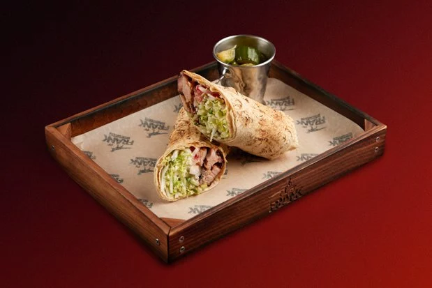 В каждом из шести ресторанов Franк целый раздел меню посвящен стритфуду. В том числе предлагают два вида шавермы: классическую с курицей и фирменную, в которую кладут мясо, снятое со свиных ребер. Классика обойдется в 590 рублей, шаверма со свиным реберным мясом — в 620 рублей.