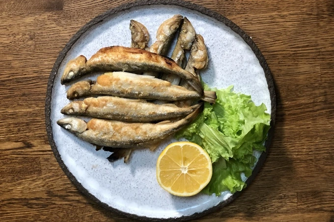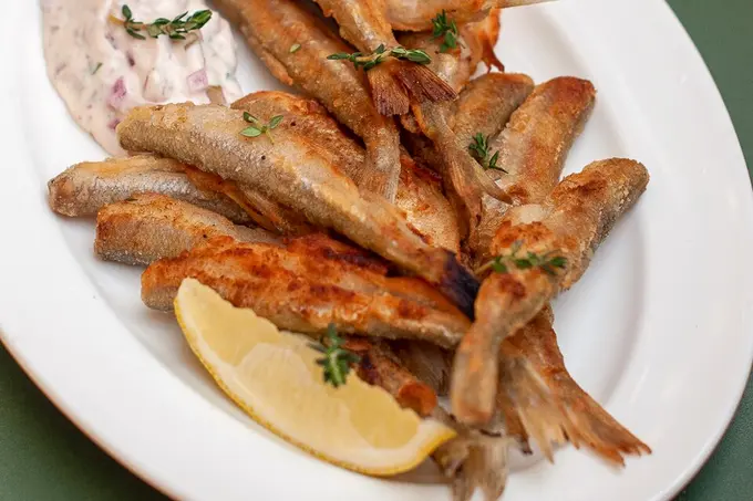 Корюшку в рыбный ресторан на Большой Зелениной привозят с Финского залива. Подают в классическом виде — жаренной в сковородке и с лимоном. Просят 1 300 рублей за порцию.