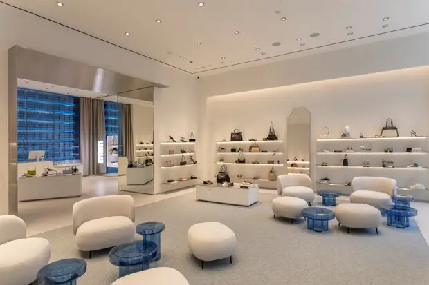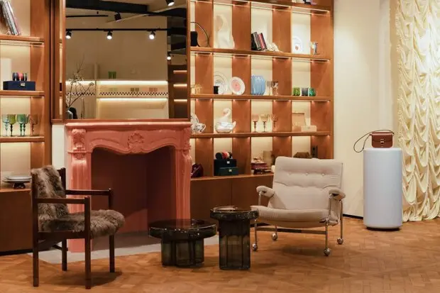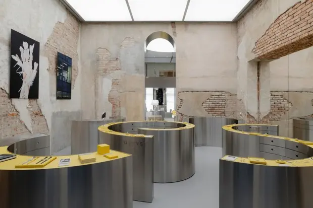 В оформлении интерьера знаковый желточно-желтый вкупе с обнаженной кирпичной кладкой и футуристичной витриной-спиралью. Пространство продумано так, чтобы взаимодействовать с украшениями было максимально удобно: есть зеркальная комната для примерки коллекцией золотых украшений, а также зона отдыха с диванами и точечным светом. Гостей угощают чаем и мадленками из Masa Madre, так что покупка подвесок-вилочек становится еще более символичной.