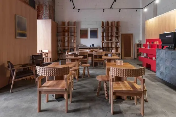 Мебельная мануфактура Uclad открыла не просто шоурум, а мультипространство, в котором работает кофейня и винный бар. Вся мебель в заведении — массивные столы, стулья и книжные полки, понятное дело, самого Uclad. Под бокал вина локальных виноделов можно присмотреть статуэтку или картину молодых российских художников, а заодно выбрать табурет с витиеватыми ножками себе домой.