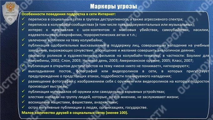 В Национальном антитеррористическом комитете (НАК) в рамках семинара по противодействию терроризму в образовательных организациях разослали материалы с «маркерами угрозы» и особенностями поведения ребенка в интернете.