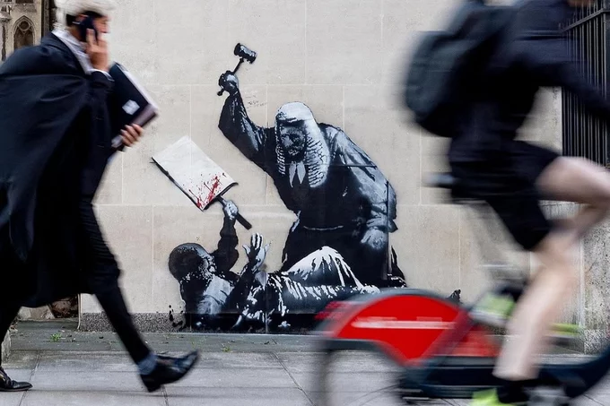 На стене здания Королевского судного двора в Лондоне обнаружили новое граффити, авторство которого приписывают анонимному уличному художнику Бэнкси. На рисунке изображена судейская фигура в парике, которая замахивается молотком на лежащего протестующего, прижимая его к земле. Работа была опубликована в его аккаунте в Instagram*.