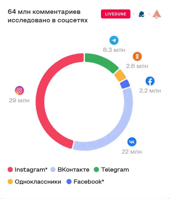 На основе базы нейросети по оценке тональности комментариев «Ольги Станиславовны» сервиса LiveDune было выгружено более 64 миллионов комментариев из русскоязычного сегмента пяти соцсетей. В выборку вошли «ВКонтакте», Instagram*, Telegram, «Одноклассники» и Facebook*.