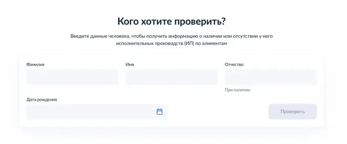 Для проверки конкретного человека понадобятся его ФИО и дата рождения. Сервис доступен всем пользователям «Госуслуг» — авторизация на портале и данные документов не требуются. В реестр попадают только должники, которые привлекались к административной или уголовной ответственности за неуплату или были объявлены в розыск.