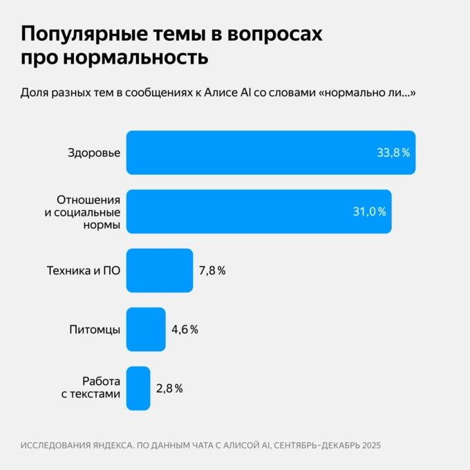 Аналитики «Яндекса» изучили запросы к Алисе AI со словами «нормально ли...» и узнали, что волнует людей. Оказалось, что больше всего их интересует здоровье — этой теме посвящена примерно треть запросов. Почти столько же вопросов связано с эмоциями, социальными нормами и отношениями. На третьем месте — техника и ПО.