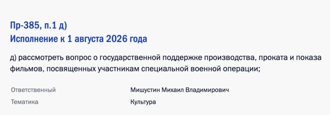Президент России Владимир Путин поручил правительству рассмотреть вопрос о господдержке фильмов об участниках специальной военной операции в Украине. В частности, планируется финансирование полного цикла: от производства до показа фильмов в кино.