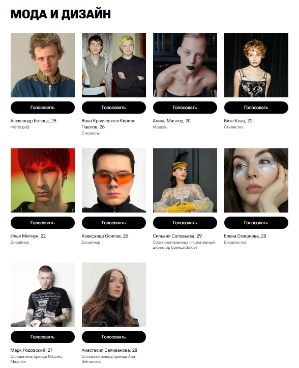 В сфере искусства — актрисы Мила Ершова и Ева Смирнова, художники и кураторы, формирующие современную культурную повестку. В категории «Мода и дизайн» — дизайнеры, стилисты (Вита Клац) и основатели брендов, в том числе Марк Родовский (Marcelo Miracles) и Сильвия Соловьева (Solove).