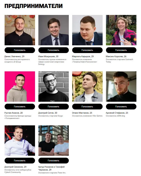 В категории «Предприниматели» — сооснователь ресторанного холдинга LB Group Денис Левченко (Ramen Land, Wu Shu, Senti Menti, J’Pan), сооснователь бренда одежды «Телодвижения» Руслан Анасов, а также представители сети киберклубов CyberX Community, стартапа Keygo, компании Vibe Games и другие.