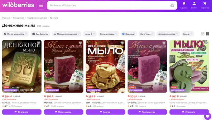 Мыло с купюрами разного номинала внутри — популярный на маркетплейсах вид товара. Редактор «Большого Города» изучил предложения на разных площадках и обнаружил большой выбор вариантов подарков в формате лотереи.