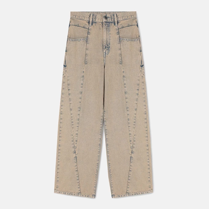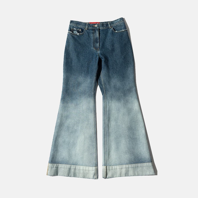 База плюс фантазийный деним — примерно так можно описать небольшую, но интересную джинсовую коллекцию российской марки. Есть свободные унисекс-джинсы светлых и индиго-расцветок, а еще джинсы с градиентным окрашиванием, с фигурными разрезами и фактурными швами по всей длине.