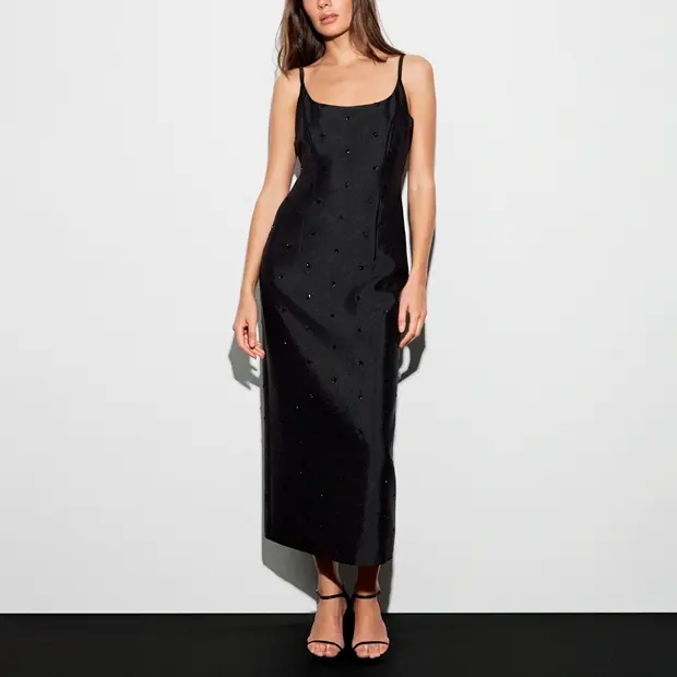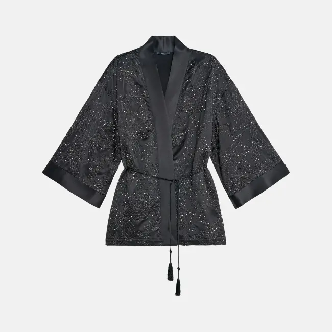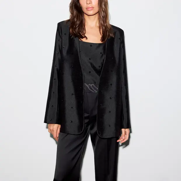 Стразы-капли на темной атласной ткани выглядят свежо и в меру празднично. Предлагаем сочетать с классическими синими джинсами или бархатными вещами, если вы стремитесь к образу в духе роскошного максимума.
