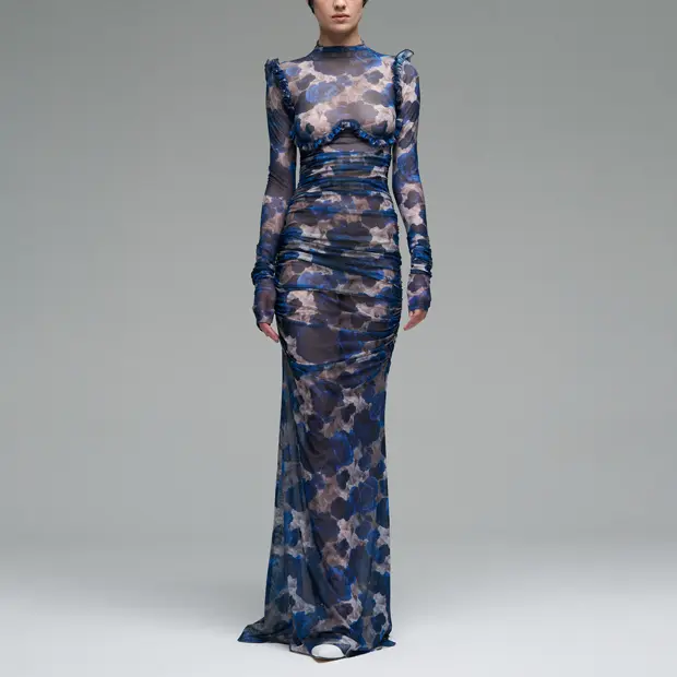 Советуем присмотреться к цветочным платьям-сеткам с красивой драпировкой — вещи выглядят в меру празднично и понравятся тем, кто устал от традиционной новогодней темы: пайеток и блесток. Дополнить образ можно длинными перчатками с тем же принтом.