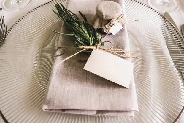 Финальный аккорд сервировки — личное приветствие. Это именно тот штрих, который превращает «просто ужин» в званый вечер. Начать можно с карточек рассадки: в эпоху мессенджеров имя гостя, написанное от руки чернилами на плотной фактурной бумаге, выглядит как драгоценность. Лучше всего смотрится бумага в тон скатерти или контрастная, но в общей гамме (например, графитовая карточка на белой тарелке).