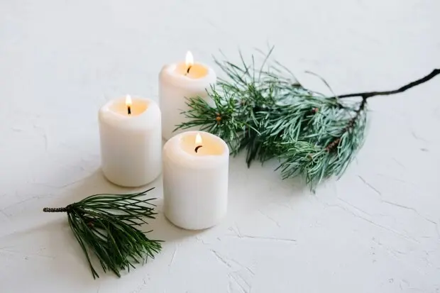 Секрет стиля — в контрастах размера и формы. Обычно используют свечи строго одного цвета, но разной геометрии, например, тонкие античные «столбики» соседствуют с устойчивым широким «пеньком». Для белого монохрома идеально подойдет гладкий классический парафин, а теплоту экостиля подчеркнут фактурные свечи из натуральной вощины.