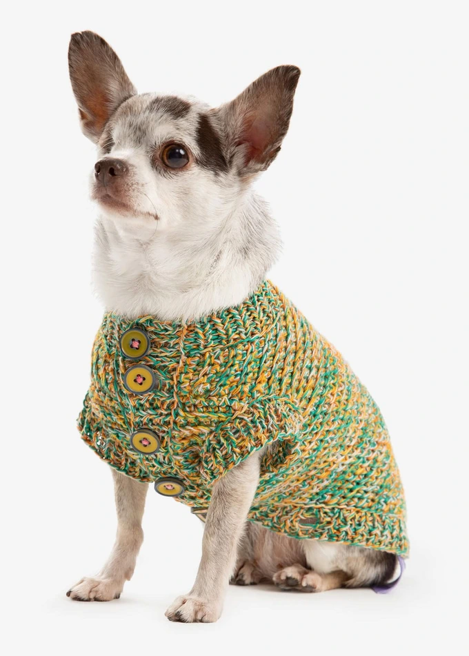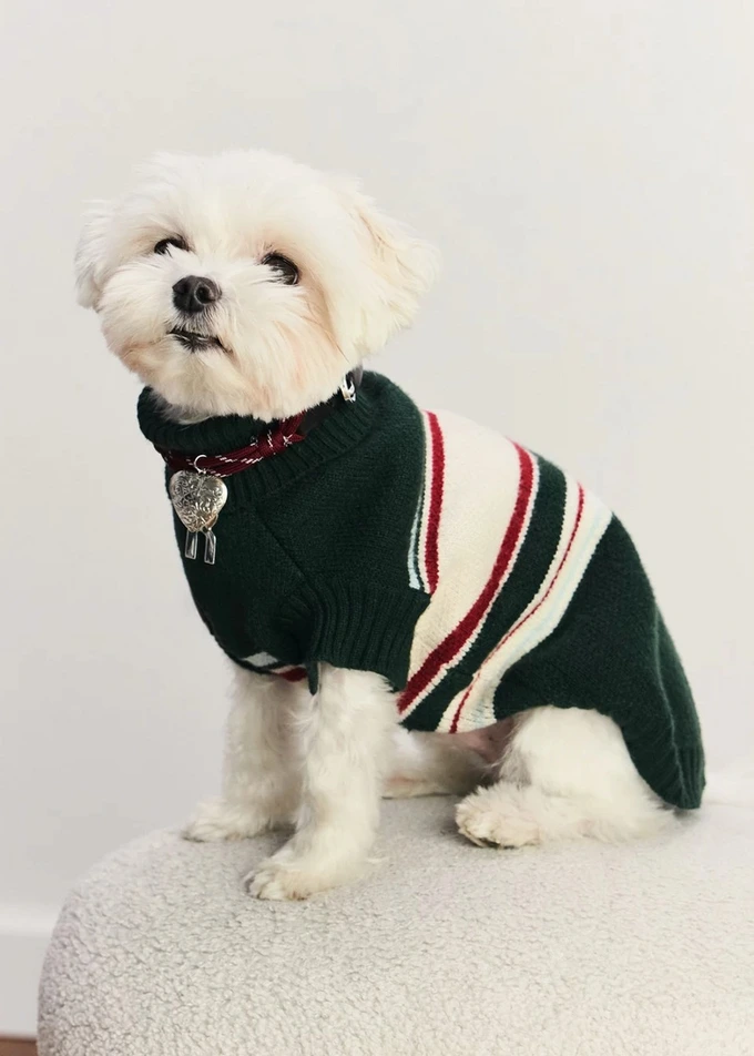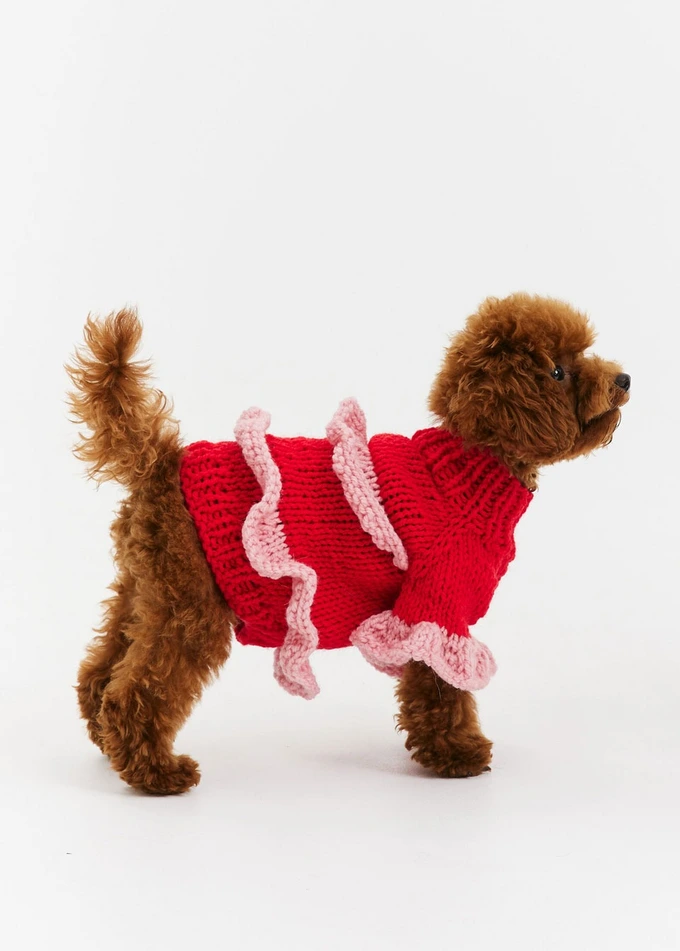 Локальный бренд вязаных вещей делает красивые свитеры для людей и их питомцев. Для собак есть двухцветные свитерочки с оборками (и такие же человеческие кардиганы), полосатые водолазки с вышитой надписью «Люблю», попоны «Панк» и ажурные воротнички жабо.