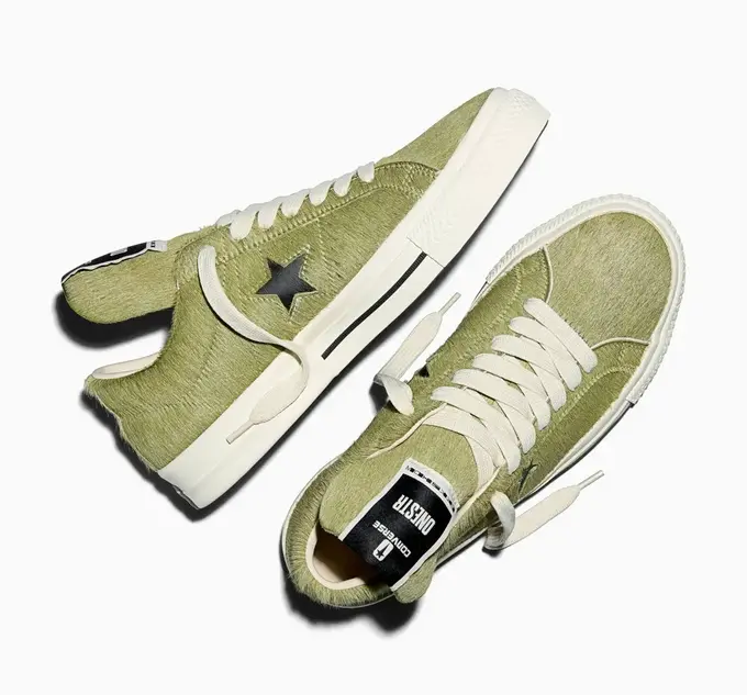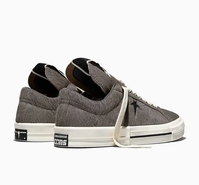 Модель сохраняет силуэт Converse One Star Pro, но получила верх из конского волоса вместо стандартной парусины. Классический логотип звезды заменен пентаграммой Drkshdw, на язычке размещена совместная бирка брендов.