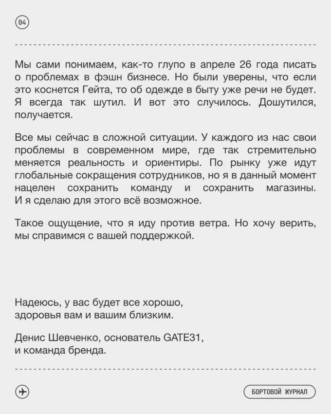 Основатель петербургского бренда Gate 31 Денис Шевченко объявил, что марка закончила первый квартал 2026 года с убытком в 31 миллион рублей. Команда сделала промокод на скидку 31 %, покупки с которым помогут бренду восстановить ресурс. За покупки с ним скидка останется постоянной.