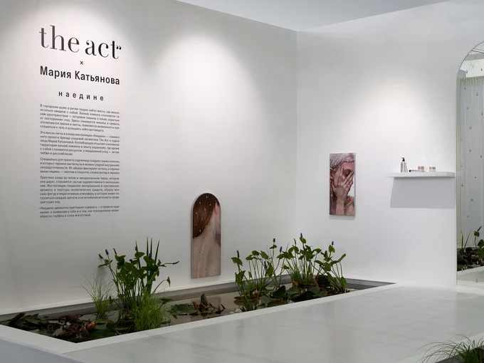 Инсталляция «Наедине» — совместный проект бренда The Act и художницы Марии Катьяновой. Коллаборация отсылает к интимной атмосфере ванной комнаты — метафоре уединения, где время с собой становится источником силы, а ежедневный уход — актом любви и расслабления.