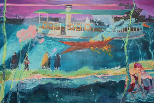 Это самая масштабная работа на выставке, и она имеет прямую связь с Нижним Новгородом. Юлия в последние годы работает с найденными архивными фотографиями, и в основе этой картины — фотография, сделанная в Невском соборе в Нижнем Новгороде. Фотография Максима Дмитриева из серии, посвященной разливу Волги и Оки на Стрелке, послужила основой для работы. Это отсылка к городу, и для нас было важно, чтобы работа Юлии попала на выставку, тем более что она была добавлена в коллекцию в тот же момент, когда мы готовили экспозицию в «Терминале А».