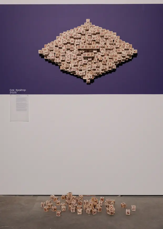 Мне нравится эта работа тем, что она соединяет в себе строгость формы и очень личную поэтику. Сначала видишь композицию, почти абстрактную, но при приближении открывается пространство для собственного опыта — буквы, слова, возможность самому что-то собрать. Игра — это всегда здорово! Для меня это не столько о языке и смыслах, но и о свободе интерпретации у зрителя. Ведь каждый создает свою версию. Я по этой работе гадаю, какой день будет: подхожу, и первое, что вижу, — мое предсказание.