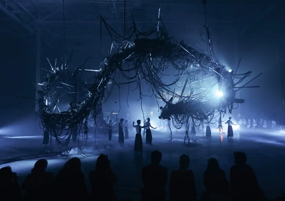 Многослойный, динамичный перформанс, где сочетаются видео, звук и живое исполнение.
