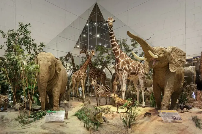Музей предлагает глубокое и увлекательное знакомство с природой. На входе встречают скульптуры динозавров и доисторических животных в натуральную величину — от мамонта до пещерного льва. Это отличное место для фотосессий и первого знакомства с эволюцией. В нескольких залах можно увидеть диорамы с животными в их естественной среде обитания, экосистемы разных континентов: от тропиков до полярных регионов. На первом этаже находится живая экспозиция, где обитают бабочки, палочники, скорпионы и паук-птицеед.