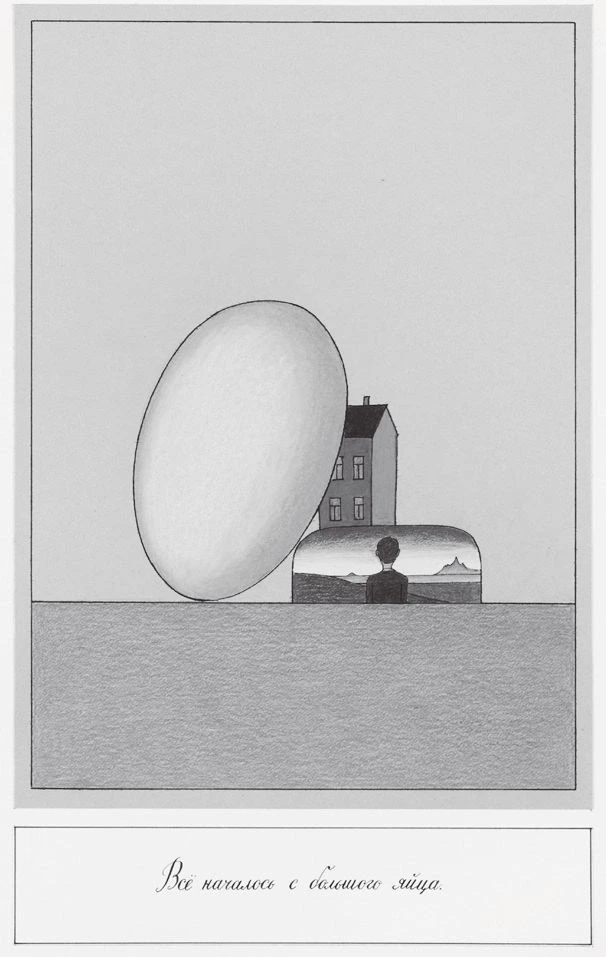 По своему происхождению из вечности, где в Ничто дремлет Все, эта желтизна имеет и другую версию, к тому же прямо соотносящуюся не с образом иконописного золотого фона, а со скрытой первоматерией образнóго, иконного письма. Это цвет яичного желтка. Мы здесь оказываемся перед той безвидностью и пустынностью, где все снова и снова начинается с чистого листа или ab ovo — от яйца, подобно тому, как у нас, на Руси, все начинается тоже с яйца, в смысле с курочки Рябы. А в этом яйце не заключен ли весь «театр абсурда»? В самом деле, о чем, собственно, эта сказка, каков смысл того, что там произошло? Может быть, это знает Пивоваров: эта его изографическая сказка о Желтом так и начинается — с «изображения образа» или с идеограммы Яйца. А дальше все движется к концу, сиречь к началу — к чистому листу, выстраиваясь внутри этой циклической траектории «строго как попало». Эта изумительная формула абсурдистского катарсиса (из «Алисы в стране чудес» в переводе Бориса Заходера) как нельзя более точно выражает логику изословесной интриги — от Яйца к Чистому листу — в упомянутом «пивоваренном» альбоме. (Между прочим: сказка про курочку Рябу как знаковый образ, своего рода прорисованный мышиным хвостиком иероглиф необъяснимости, фигурирует у Пивоварова — так, между прочим — в одном из автобиографических фрагментов.)