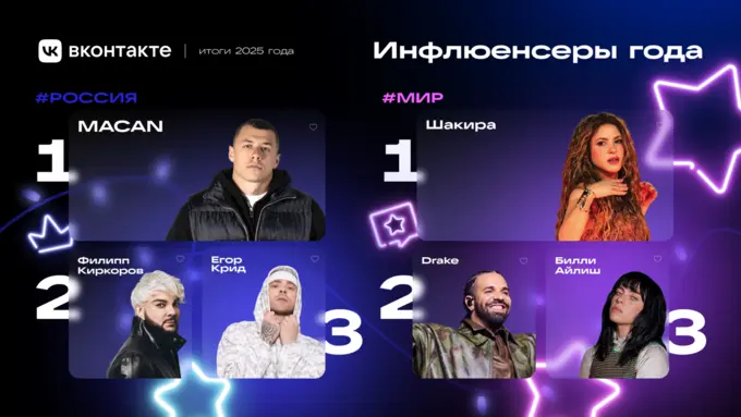 Brand Analytics и «ВКонтакте» рассказали, какие персоны и темы привлекли внимание пользователей площадки в 2025 году. В список попали селебрити, спортсмены, фильмы, сериалы, аниме и игры.