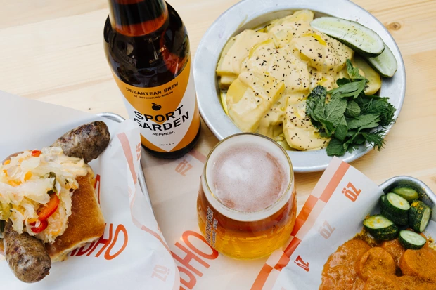 В меню — карривурст с маринованными овощами, братвурст на тарелке с горчицей, сэндвич с братвурст и сырным соусом, картофельный салат со шпреевальдским огурцом.