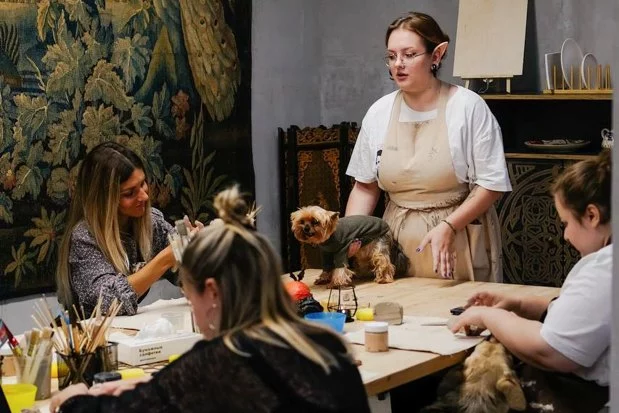 Студия керамики «Бисквит» предлагает разнообразие курсов как для новичков, так и для тех, кто уже владеет основами гончарного дела. Двери мастерской открыты для гостей с животными, ведь для некоторых их питомцы — источник вдохновения. На занятия можно приходить с собаками любых пород и размеров, главное, чтобы ваш любимец вел себя спокойно. Во время мастер-класса животные смогут как отдохнуть и пообщаться с сородичами, так и стать соавторами изделий владельцев — например, поделившись отпечатком лапы.