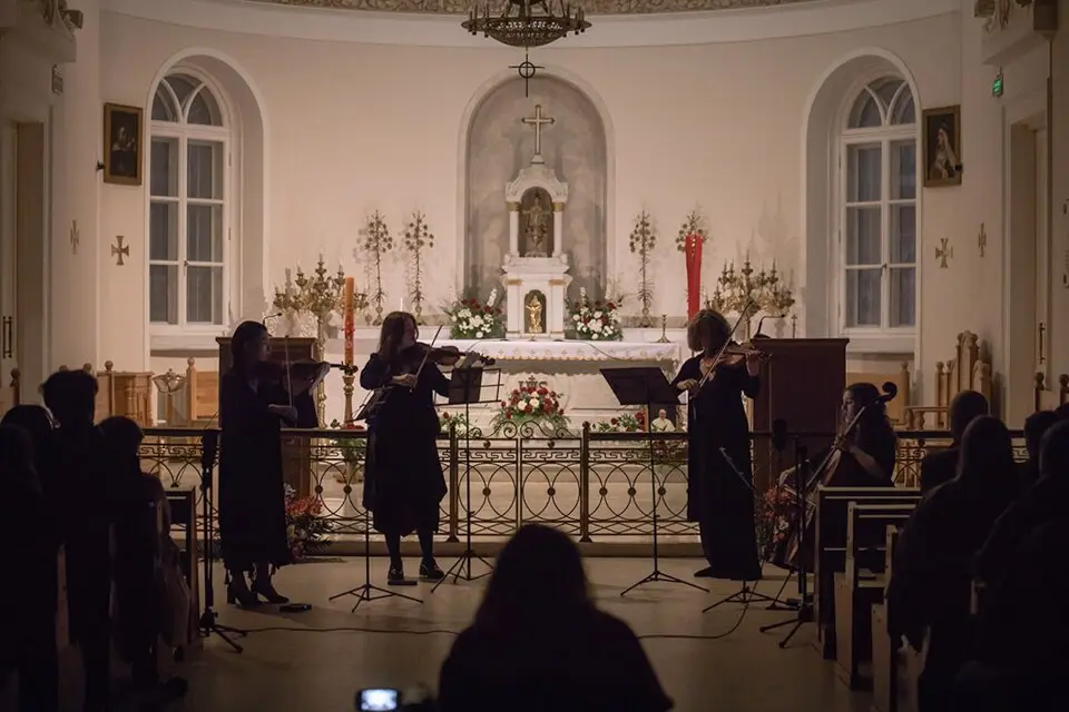Пятница. Темный московский вечер. В храме Святого Людовика проходит концерт. Прямо у входа в пресвитерий (пространство, куда во время службы допускаются только священники) играет ансамбль старинной музыки L’Aspetto Musicale: барочная виолончель, скрипка и флейта, клавесин и вокалистка Елизавета Белоконь.
