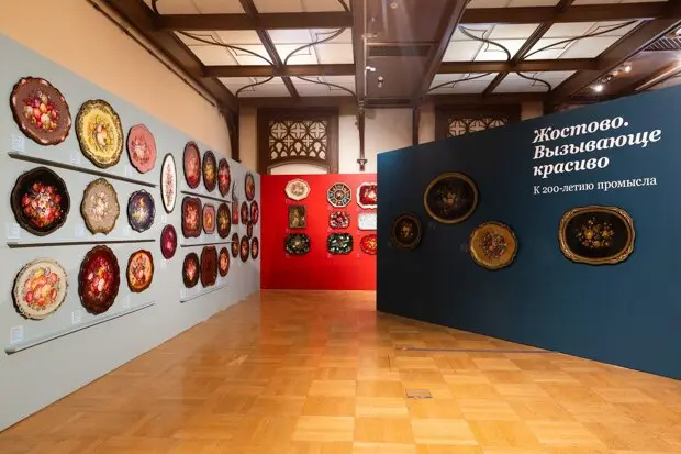 Впервые в Москве — подносы из частного собрания Александра Бычкова и его необычной галереи в деревне Жостово, а также изделия игрушечного цеха Жостовской фабрики (расписные лопатки, совки, ведерки и лейки) и сувениры, выпущенные к юбилею Александра Пушкина в 1949 году или к Олимпиаде-80.