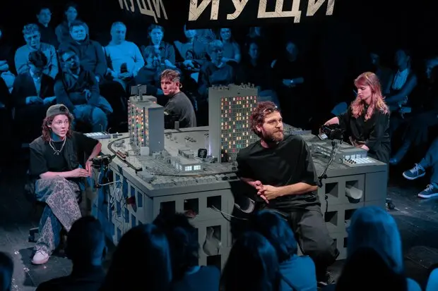 Чтобы исследовать человеческий космос, артисты отстраняются от персонажей и становятся проводниками между их историями и зрителями. А настоящих героев спектакля — красивых и нелепых, горьких и веселых, легко узнаваемых жителей густонаселенных многоэтажек — воплощают крошечные фигурки горожан, застывшие в разных позах. Фрагменты их повседневности ловит и передает на большие экраны ручная камера — так зрители могут наблюдать одновременно за рождением и воплощением предметного спектакля.