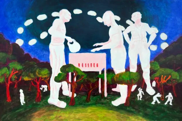 Живописные работы Анны Афониной используют пленочные образы как основу для искажения и контакта и соседствуют с инверсивными витражами Милены Стрелковой, исследующими жизнь и смерть, разноцветное изобилие и материализм. Текстиль Людмилы Барониной разворачивает мотив поиска и взросления во вселенной абсурда, ковры Вадима Михайлова работают с орнаментом, повтором и смещением культурных кодов, деревянная скульптура Ульяны Подкорытовой обращается к метаморфозе и вымышленной архаике, а объект Ирины Кориной — к разочарованию и утрате утопических надежд.
