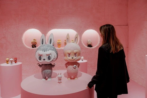 Экспозиция построена как серия эффектных пространств: пушистый розовый зал с огромными Labubu, медведи Bearbrick, персонажи «Симпсонов» и Рональд Макдональд, Джефф Кунс и его разноцветные «собаки» из воздушных шариков, а также семья персонажей Kaws.