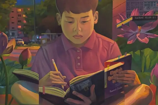 На первом этаже представлена серия «Домашнее задание» (калм. «Герин даалhвр»). Для всех работ здесь подобраны названия на калмыцком языке — слова и выражения, знакомые многим, кто рос в Калмыкии. Художник не владеет языком свободно, хотя и считает его родным. Работы на втором этаже посвящены «культу знаний», укоренившемуся в коллективном сознании жителей Калмыкии со второй половины прошлого века. Если приход зимы в Республике ассоциируется с буддийским праздником Зул, а весны — с Цаhан саром, то наступление осени связано с отбытием студентов на учебу вдали от дома.