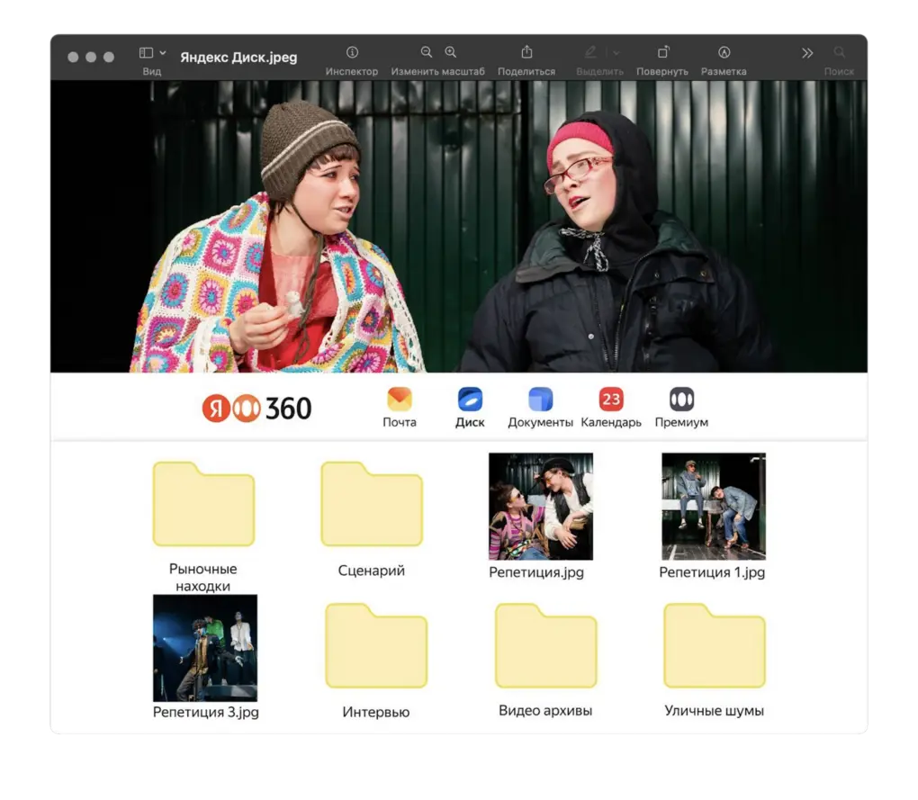 Чтобы создать достоверный спектакль, нужно было собрать и творчески переработать огромное количество материалов: видео- и аудиозаписи разговоров, портреты героев, записи уличных шумов, фотографии случайных рыночных находок. Все это собирали в общий архив с доступом для каждого участника проекта. Облачное хранилище Яндекс Диска стало вместилищем воспоминаний и кладезем идей. Все хранится надежно и аккуратно разложено «по полочкам»: пользоваться сервисом — все равно что залезать в коробку с сокровищами и с первого раза вытаскивать нужный предмет. В ходе работы над спектаклем на Яндекс Диск также складывали эскизы декораций, наброски сцен, записи интервью актеров о том, чем для них стала работа над спектаклем. Их транслируют в фойе «Практики» перед спектаклем, а Диск помог сохранить важные моменты и поделиться ими, превращая цифровое пространство в хранилище жизненных историй и впечатлений.