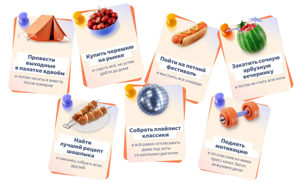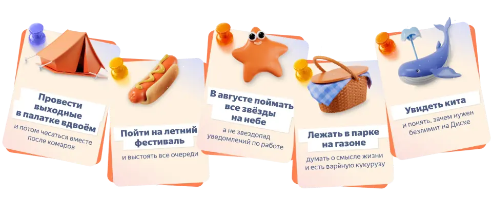 В этом году жители Новогоднева играют в «Бинго» от Яндекс 360, где все сбудется. Ела-Пална, Дискуша, Телемостыч и Календарик приглашают наших читателей сыграть в новогоднее бинго и собрать план из желаний на следующий год. Это поле из 25 карточек, где каждая карточка — план или пожелание на следующий год. Пользователь набирает созвучные с его эмоциями карточки и получает призы, которые будут приходить от Яндекс 360 и партнеров на Почту, в Календарь или Диск на протяжении года.
