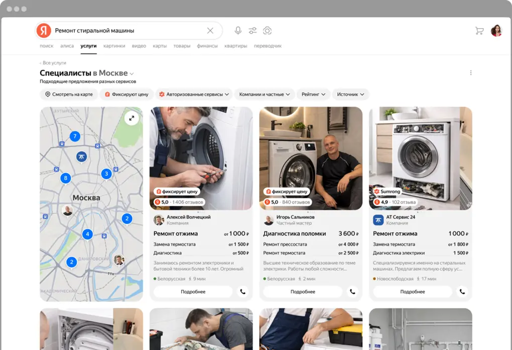 Логичным продолжением этой эволюции становится объединение рынка в единой поисковой среде. Вместо переходов между несколькими сервисами доступ к информации из разных источников открывается в одном окне — в Поиске по услугам от Яндекса.