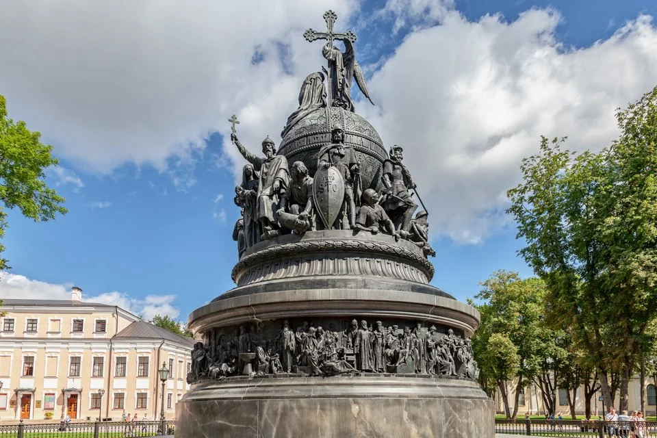 За главными воротами Софийской площади первым туристов встречает памятник «Тысячелетие России». Этот бронзовый монумент установлен в 1862 году в честь тысячелетнего юбилея русской государственности.