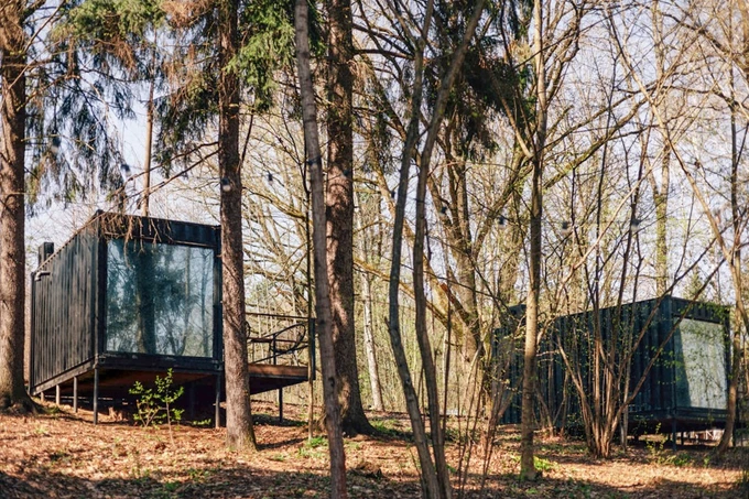 Комплекс находится на первой линии Пироговского водохранилища — дорога от Москвы занимает всего около получаса. Десять грузовых морских контейнеров здесь переоборудовали в минималистичные домики с панорамными окнами, выходящими на воду.