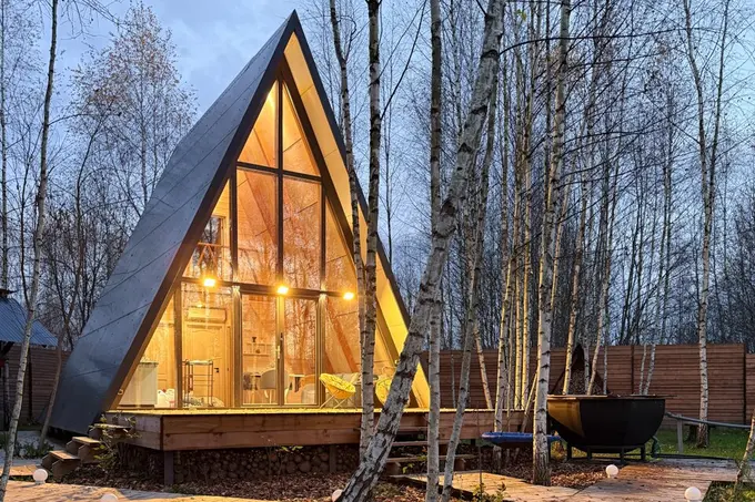 Этот глэмпинг предлагает переосмыслить дачный отдых. Вместо старых деревянных построек гостей ждет фотогеничный A-frame с премиальным дизайном. Большие панорамные окна в домике совсем не пропускают зимний холод благодаря системе теплого пола. В распоряжении стабильный интернет для работы или фильмов.