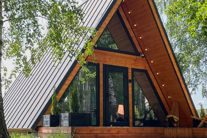 Классический A-frame на приватной территории в Раменском районе. Формат дома-шалаша давно стал хитом среди тех, кто ищет эстетичные локации для загородных выходных. Внутри светло и просторно: на первом этаже есть полноценная кухонная зона, а под самой крышей — уютная спальня. Интерьер располагает к неспешному отдыху: можно включить фильм, попросить колонку Алису поставить музыку или смотреть на лес через большие окна.
