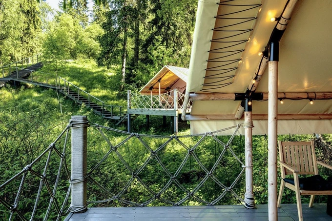 Гостям предлагают около 20 вариантов размещения, включая стеклянные сферы и уютные шале. Это полноценные гостиничные номера на природе, куда при желании можно заказать еду из ресторана