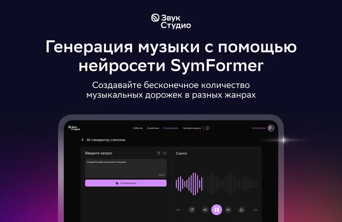 Сервис для музыкантов «Звук студио» представил генеративный искусственный интеллект для создания сэмплов. AI-генератор SymFormer по текстовому запросу создает неограниченное количество музыкальных дорожек в разных жанрах.