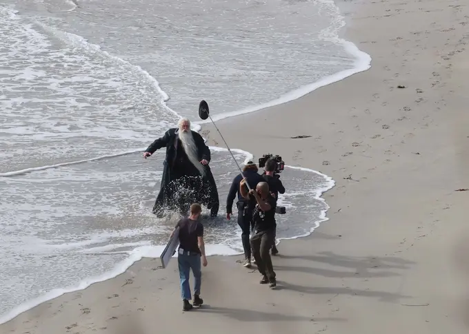 Актера сфотографировали во время съемок сцены на ветреном побережье в Корнуолле, а позже его же заметили на пляже, где он зачитывал свои реплики по большим карточкам с текстом, которые держал один из членов съемочной группы.