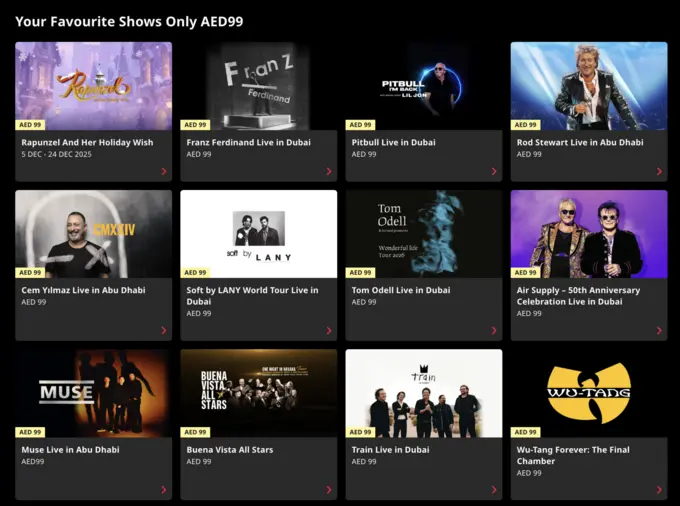 Компания Live Nation, занимающаяся организацией концертов по всему миру, объявила распродажу билетов на ряд мероприятий, которая продлится с 8 по 14 декабря. Цена будет единая для всех — 99 дирхамов (чуть больше 2 тысяч рублей).